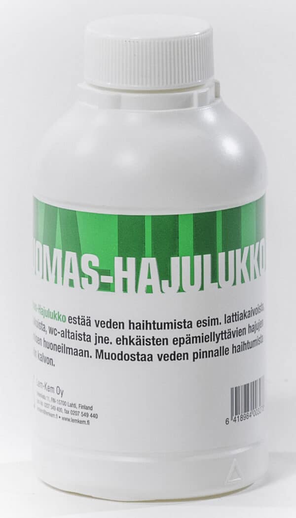 Tuomas-Hajulukko estää veden haihtumista esim. lattiakaivoista, hajulukoista, wc-altaista jne. ehkäisten epämiellyttävien hajujen leviämisen huoneilmaan. Muodostaa veden pinnalle haihtumista estävän kalvon.